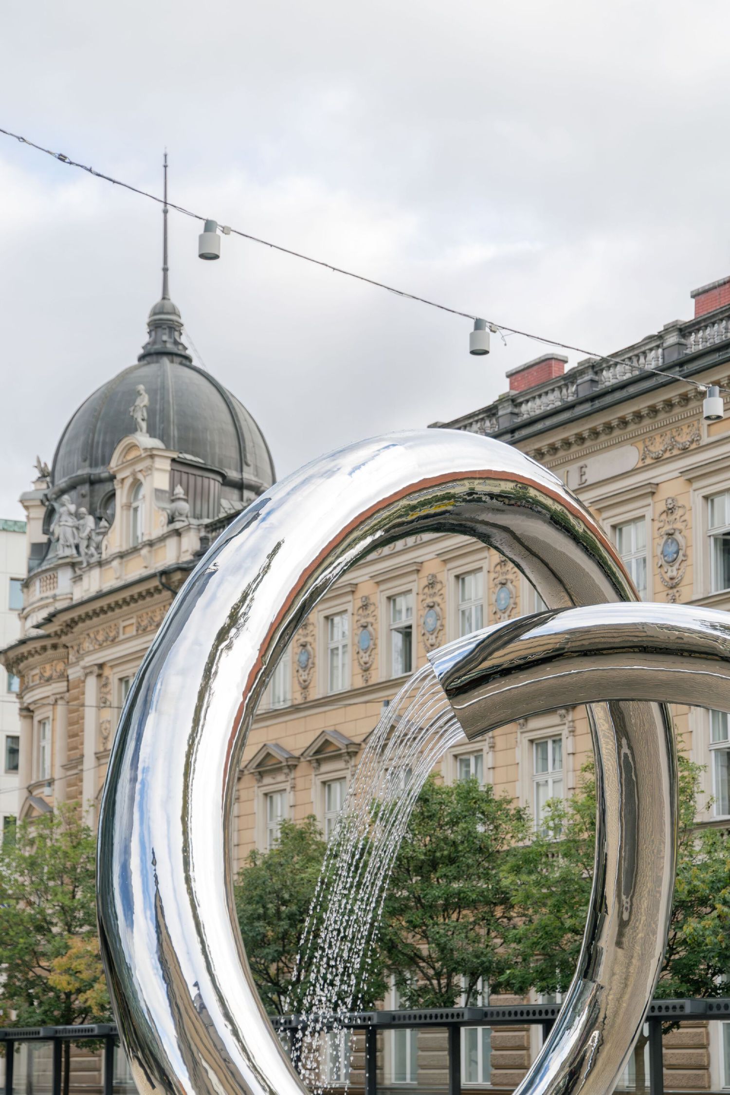 Fontana je autorsko delo ljubljanskih arhitekata koje formira intiman javni prostor kroz kontinuiranu čeličnu petlju i simboliku toka vode.