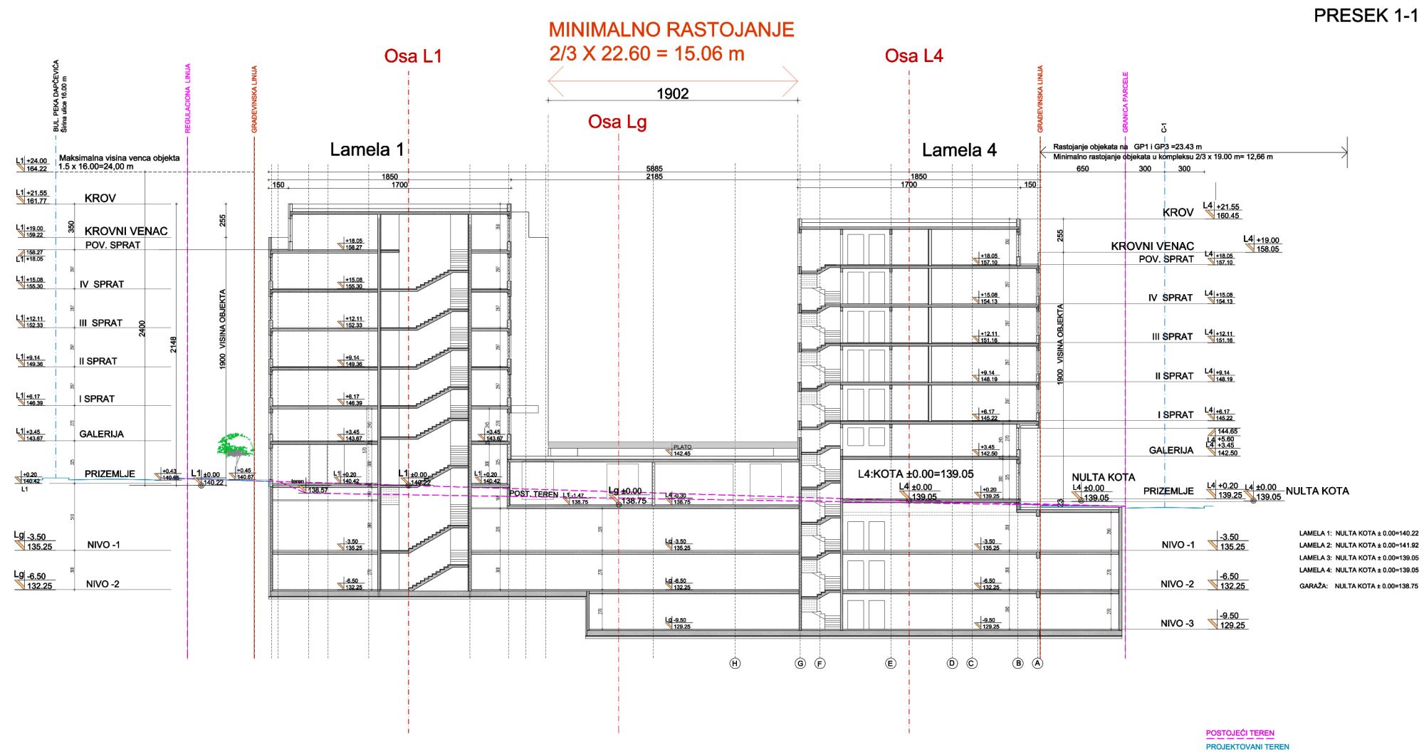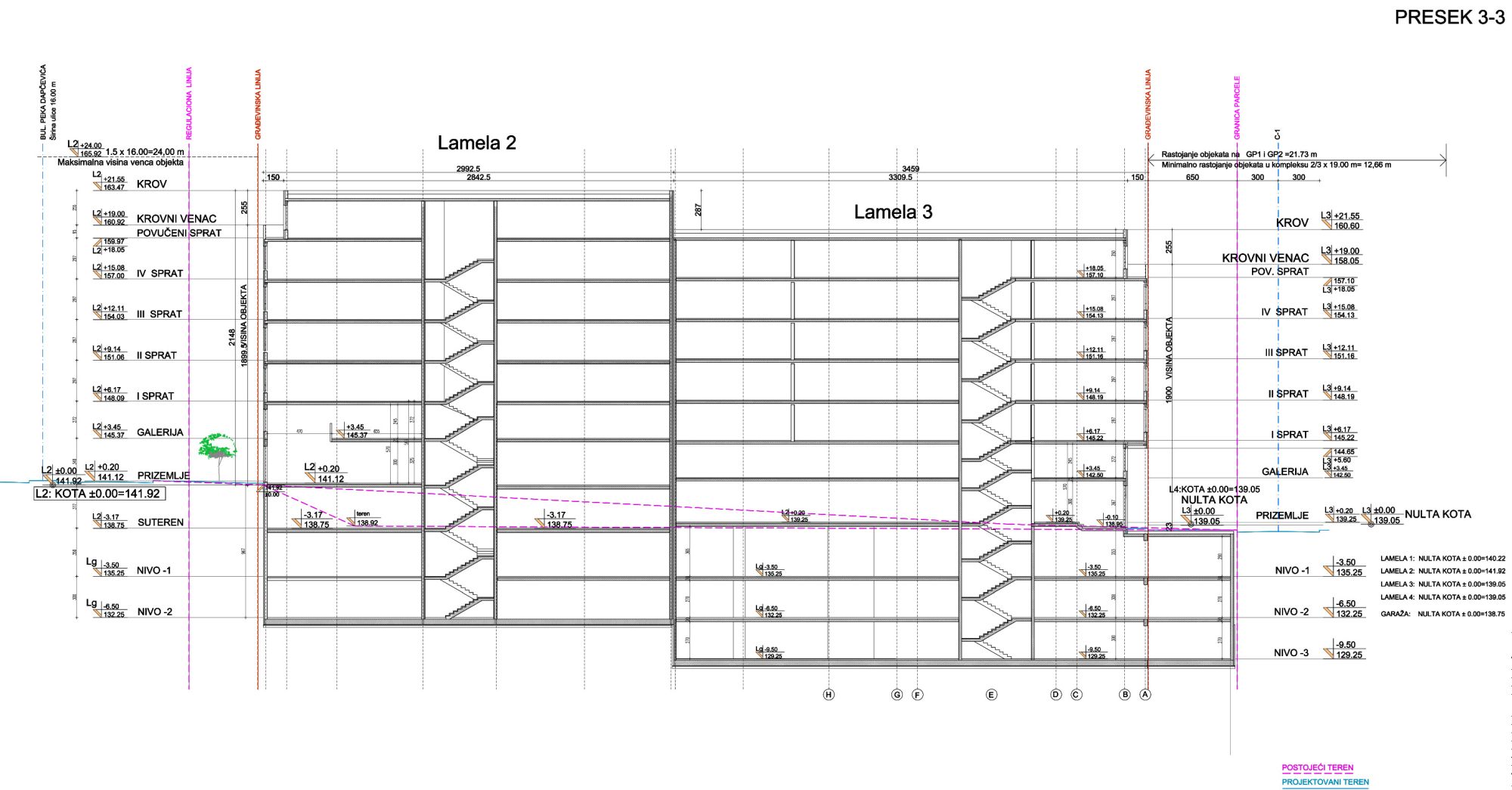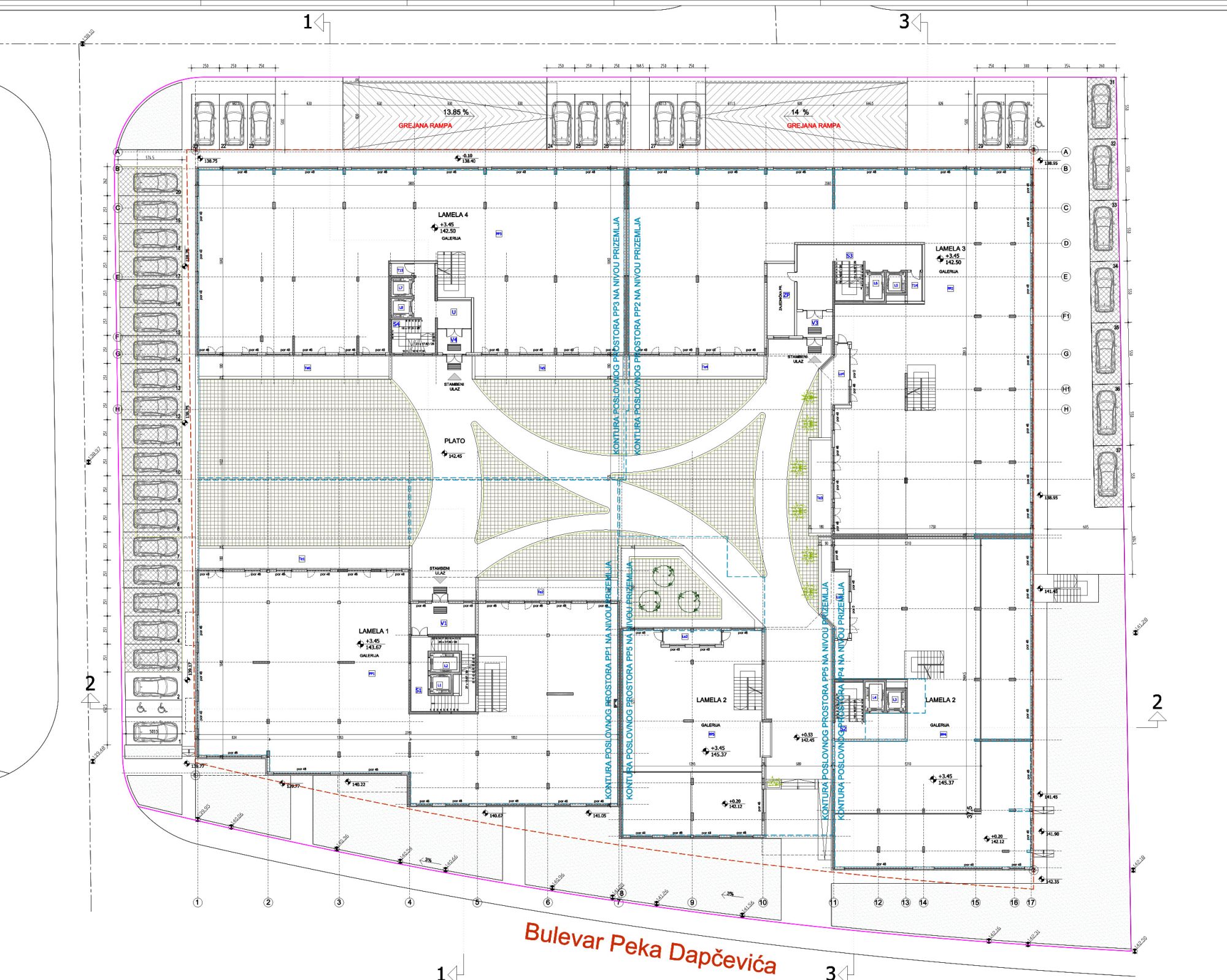 Svaka lamela ima poseban pristup podzemnim etažama u vidu liftova i stepenišnog prostora. U okviru ova tri nivoa smešten je i odgovarajući broj tehničkih prostorija i prostor za TS na na nivou ‐1.