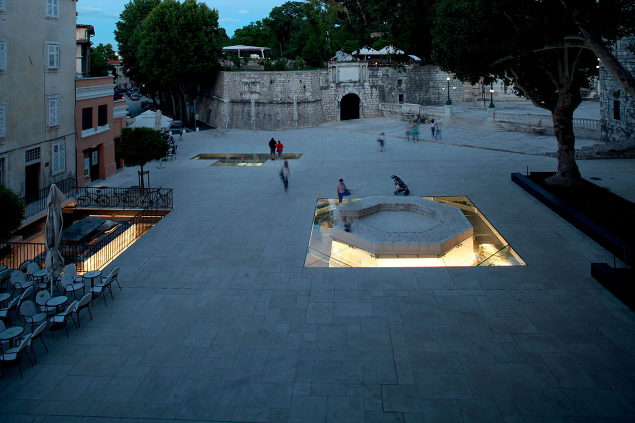 Jedan drugi primer dolazi nam takođe sa Sredozemlja, ali iz bivše nam države, iz Zadra. Tako je u ovom gradu u severnoj Dalmaciji jedan deo trga Petra Zoranića urađen na taj način prilikom rekonstrukcije iz 2013. godine, koju su uradili arhitekti iz studija Kostrenčić-Krebel, te se ispod renesansnog trga da videti i stariji nivo.