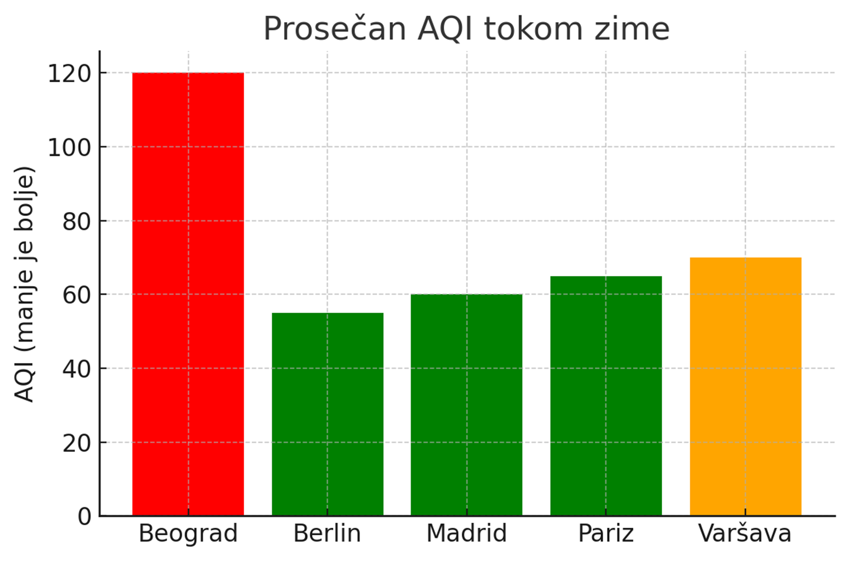 Kao primer, Vasilev ističe da je Valjevo imalo 132 dana s prekoračenjem dozvoljenih vrednosti PM čestica, od čega čak 127 dana ili 96% tokom grejne sezone — što je skoro četiri puta više od dozvoljenih 35 dana godišnje. To jasno pokazuje uzročnu vezu između grejanja i zagađenja.