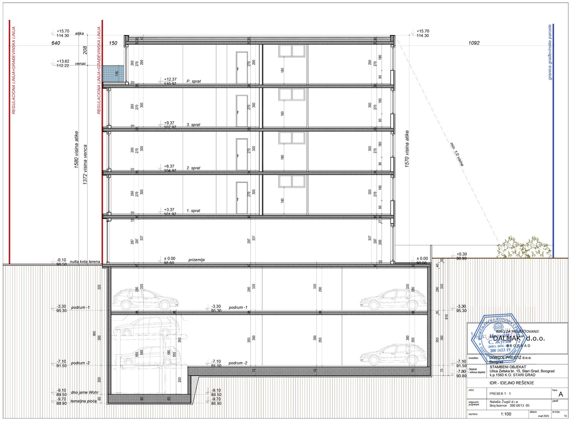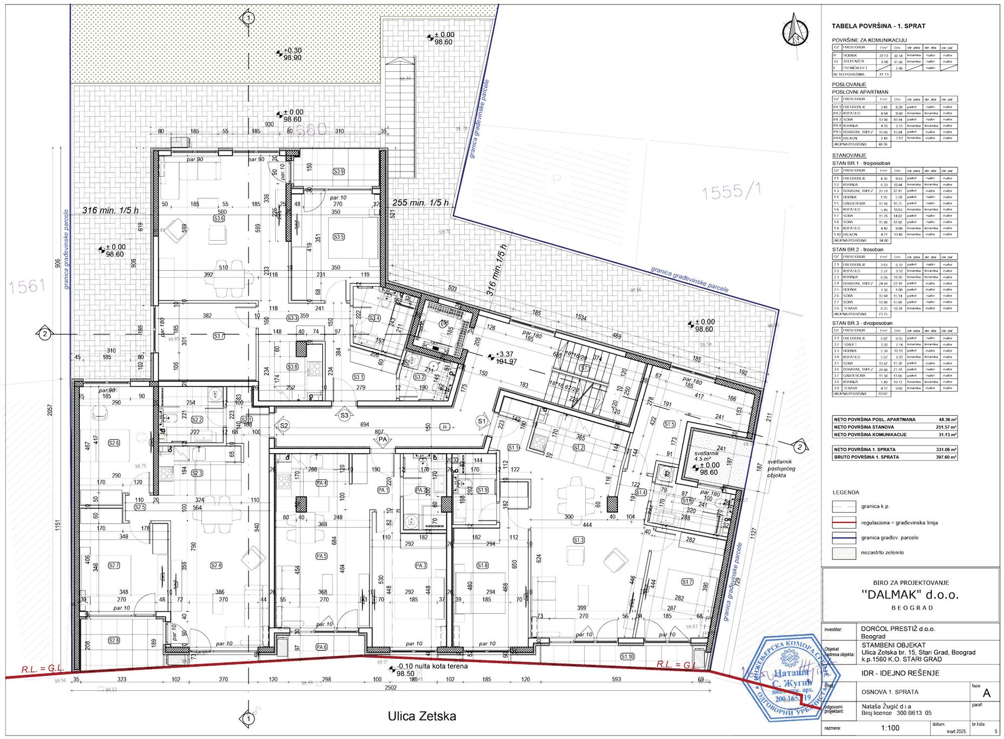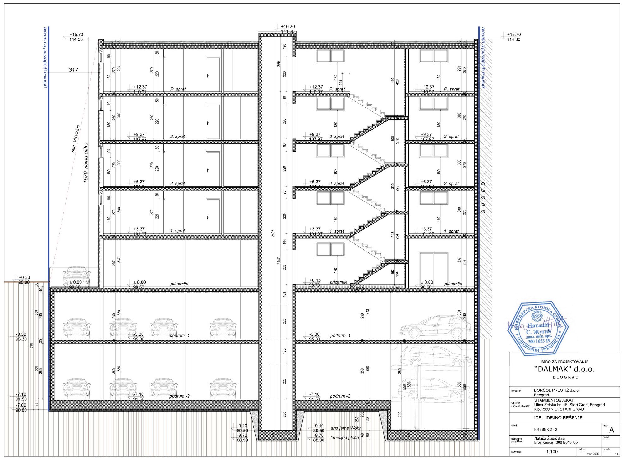 Na parceli se projektuje objekat spratnosti 2Po+Pr+3+Ps koji je po funkciji stambeno-poslovni. Nadzemna BRGP objekta iznosi 1.985 m², podzemna 1.029 m², čime dolazimo do ukupne bruto površine objekta od 3.014 m². Korisna površina garaže iznosi 849 m², što je po Pravilniku svrstava u srednje garaže.
