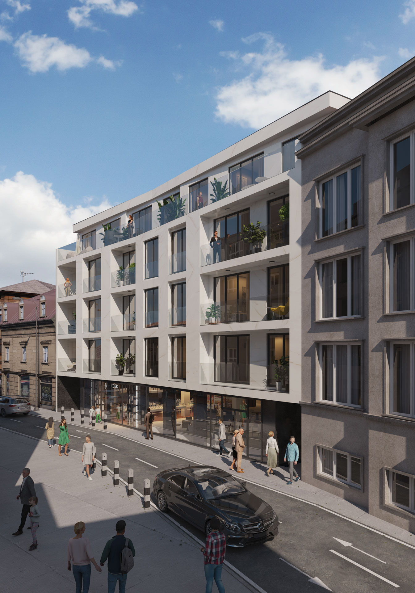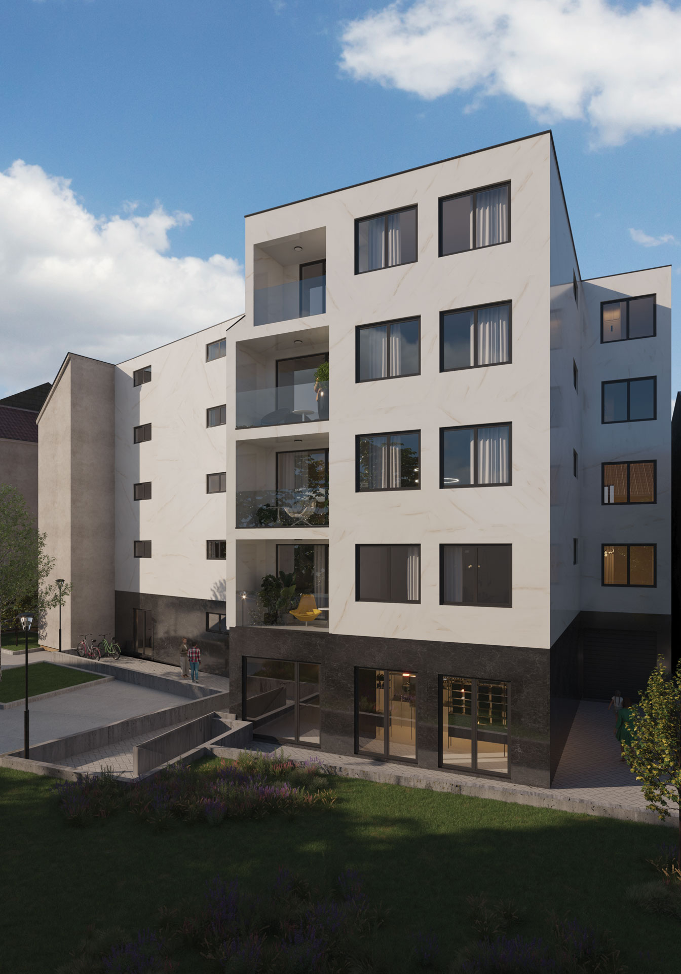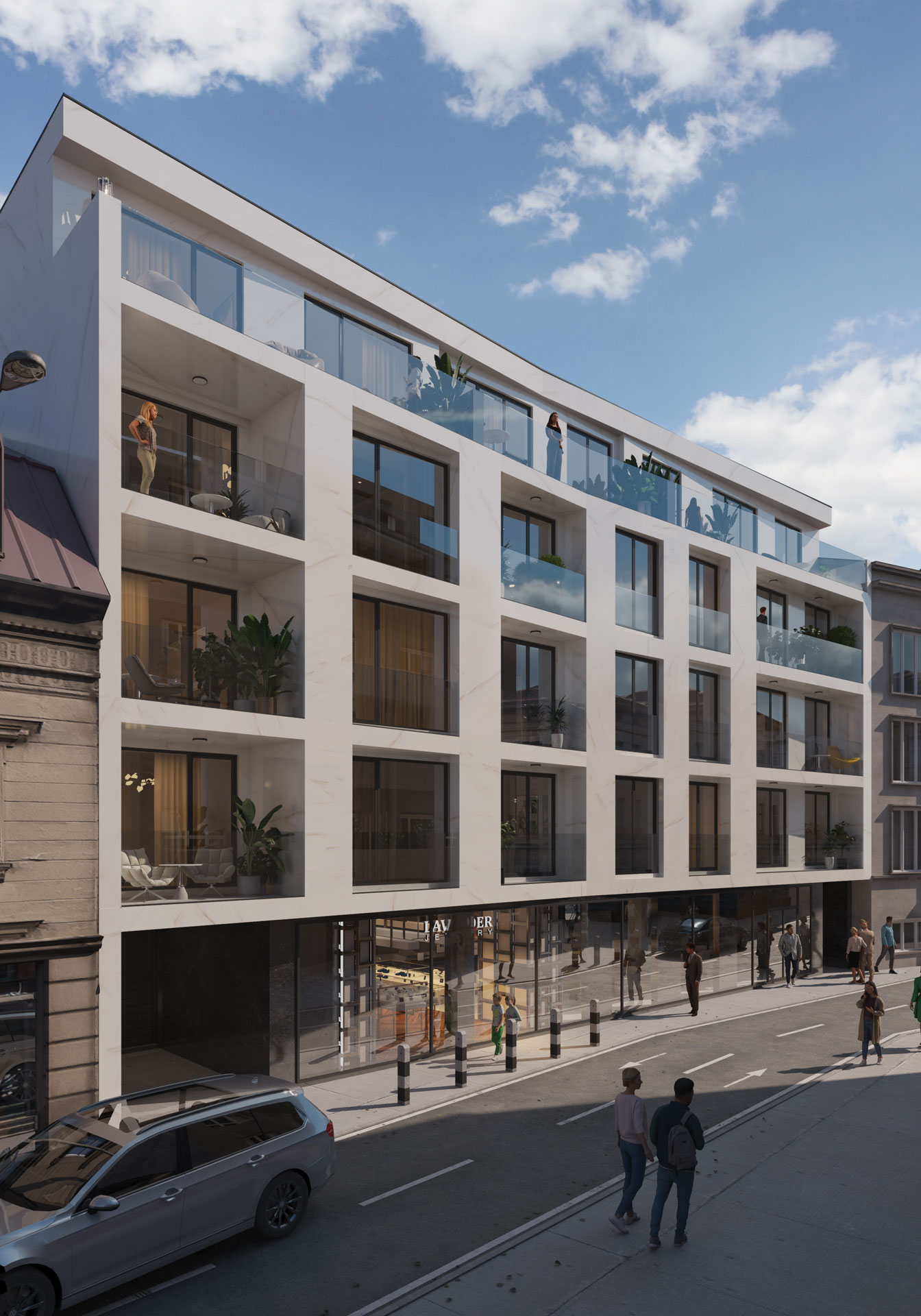 Na prvom spratu projektovan je jedan poslovni apartman neto površine 48,74 m² i tri stana. Na drugom, trećem i povučenom spratu projektovana su po četiri stana. Ukupno je projektovano 15 stanova. Na svakom spratu projektovane su vertikalne komunikacije, kao i horizontalna komunikacija.