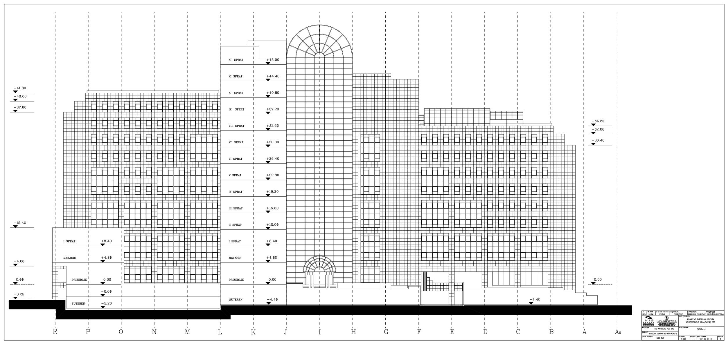 Građevinski traktovi su kaskadno komponovani, pa se spratnost kreće od suteren + prizemlje + mezanin + 12 spratova do suteren + prizemlje + mezanin + 7 spratova. Uz bočne ulice formirani su niži aneksni delovi, a ispod celog objekta prostire se etaža suterena, delimično izvedena u dva nivoa. Pešački pristupi rešeni su sa dva ravnopravna ulaza u centralni hol, sa južne i severne strane, dok je glavni kolski pristup iz Ulice Narodnog fronta. U garažu u suterenu, kapaciteta oko 200 vozila, ulazi se preko kosih rampi sa bočne strane.