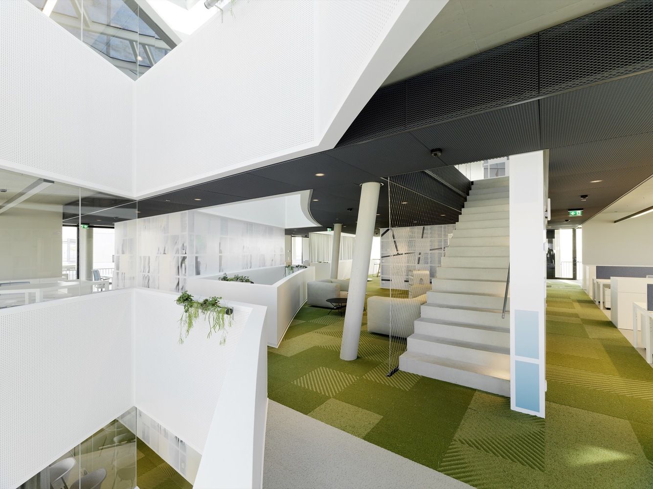 Ništa manje interesantan nije ni enterijer u kojem je ponovljena kvadratna matrica uz naglašavanje tekstura na horizonatnim površinama dok su zidovi uglavnom beli.