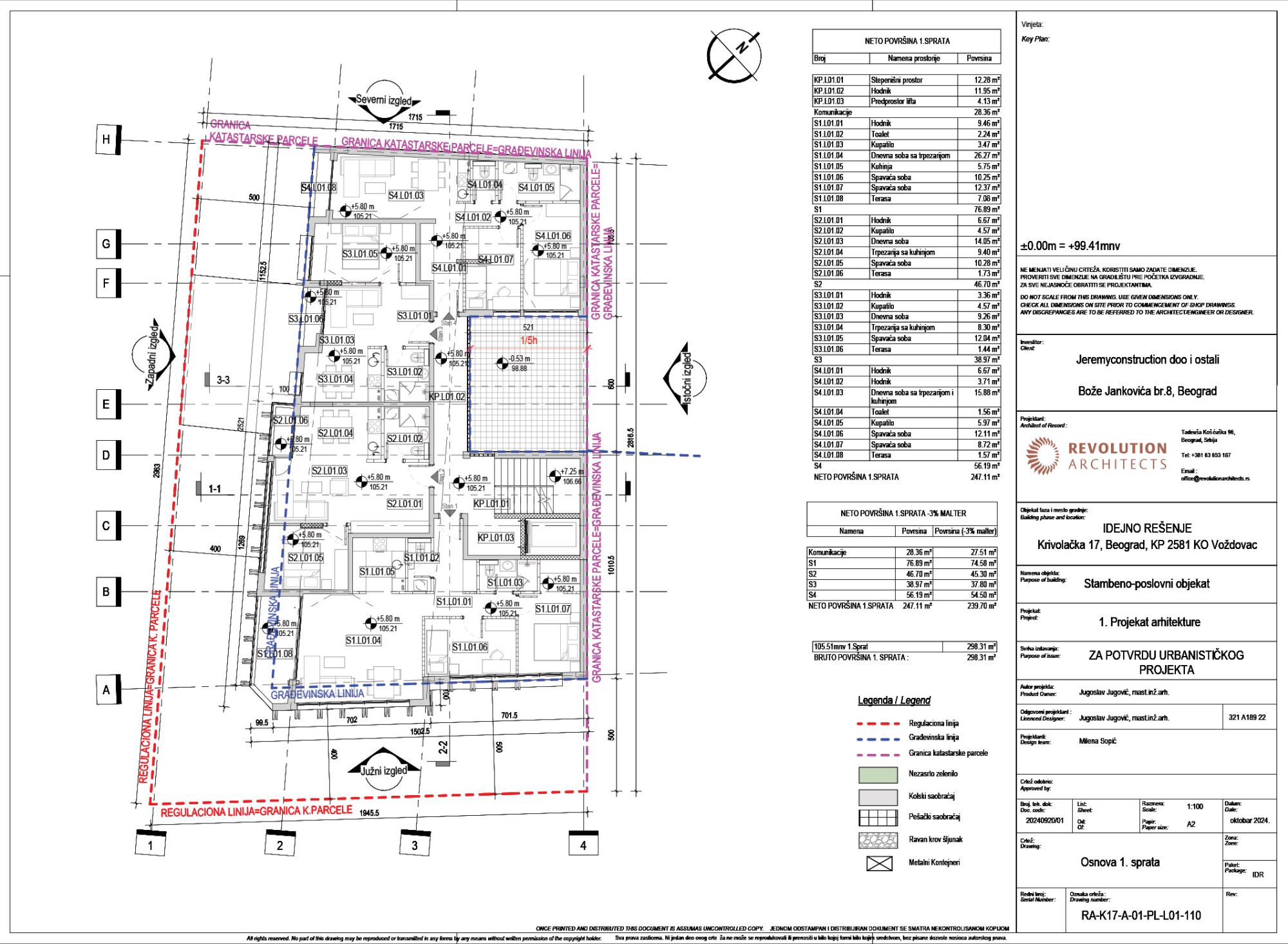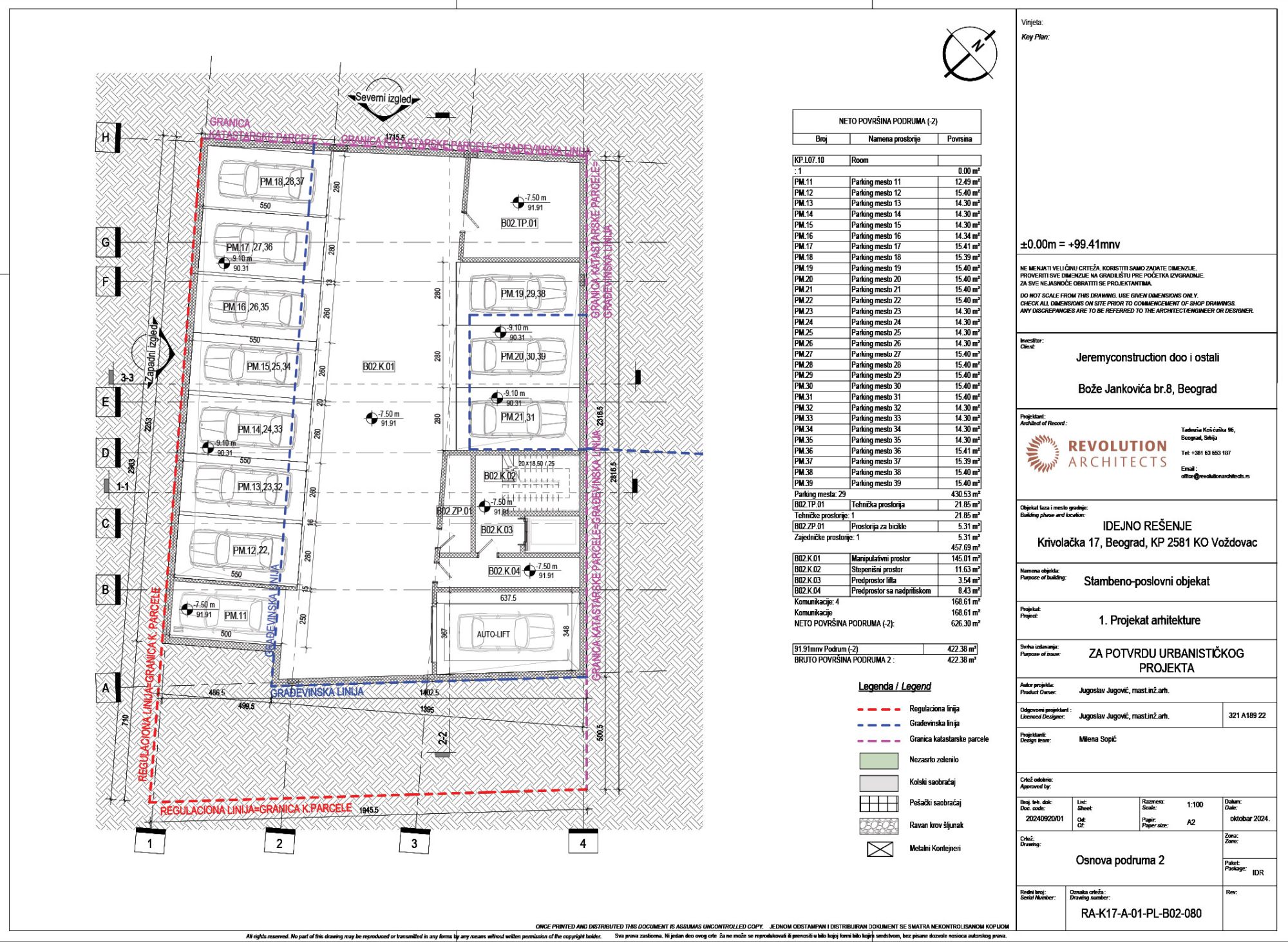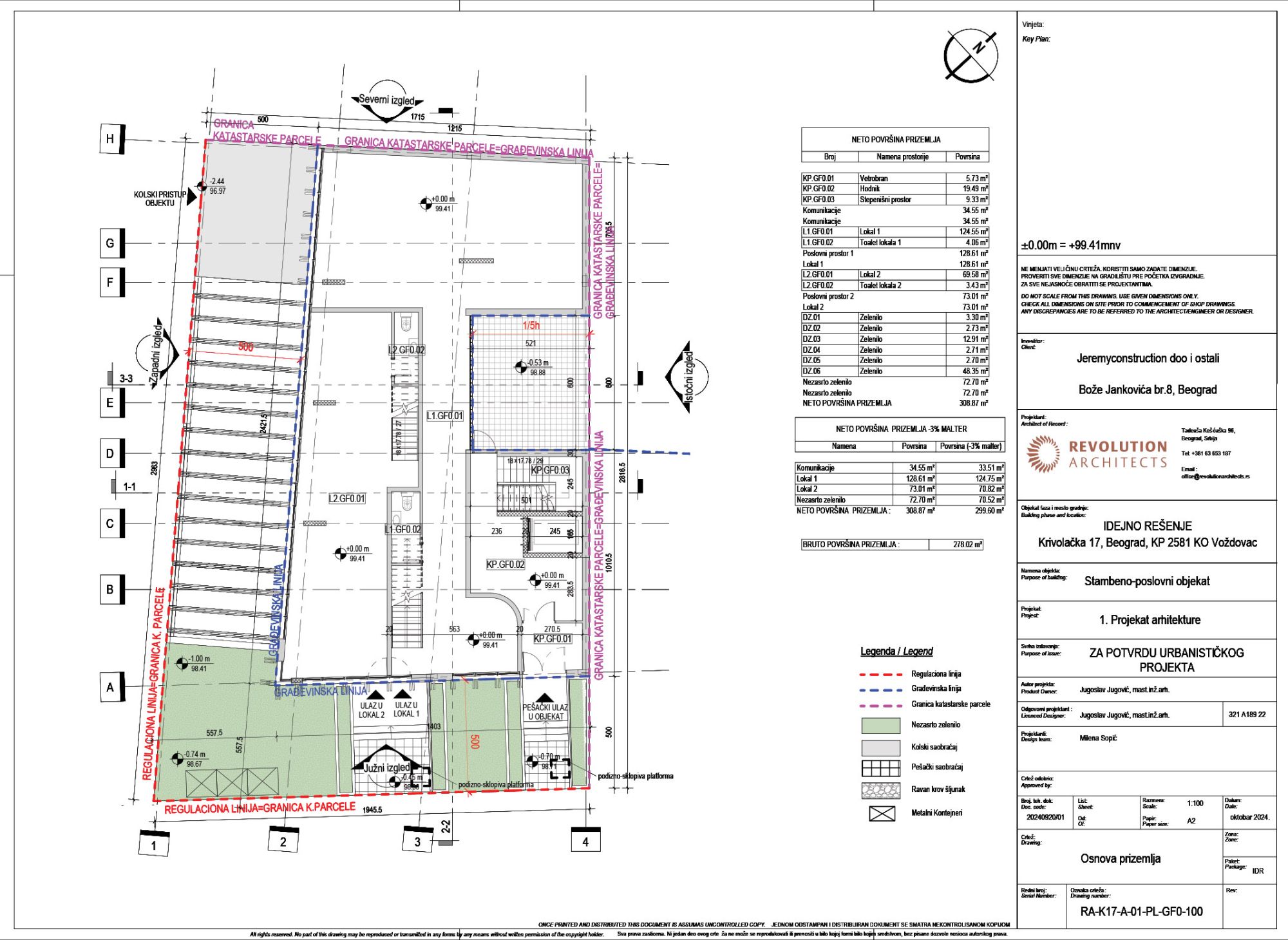 Nosilac izrade predmetnog urbanističkog projekta i idejnog rešenja arhitekture je beogradski biro Revolution Architects, kao odgovorni urbanista potpisana je Danijela Mirković, dia, a kao odgovorni projektant Jugoslav Jugović, mia.