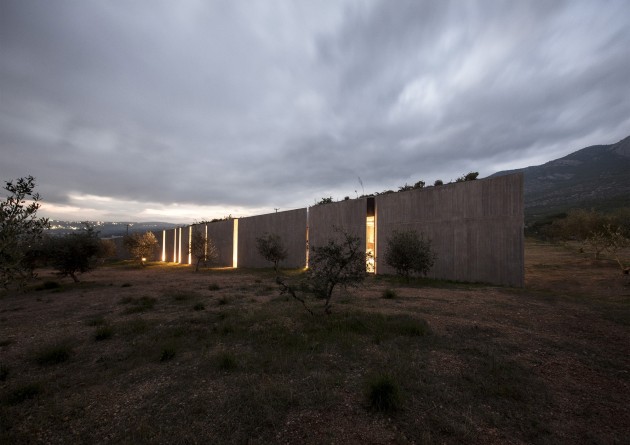 Usred trista stabala maslina, između ravnice i Gerania planina na severu usidrena je ova rezidencija. Kuća je organizovana kroz dva unutrašnja dvorišta, koja su u celokupnoj formi jasno definisanog trougla, međutim delimično ošupljenog. Trouglasti plan levkasto se otvara prema jugu. To je ujedno i jedan od ulaza u dvorišta koji zajedno sa drugim, smeštenim između dnevne i spavaće zone, čini da kuća ima otvoreni koncept prema dvorištima ali donekle zatvoren prema divljini.