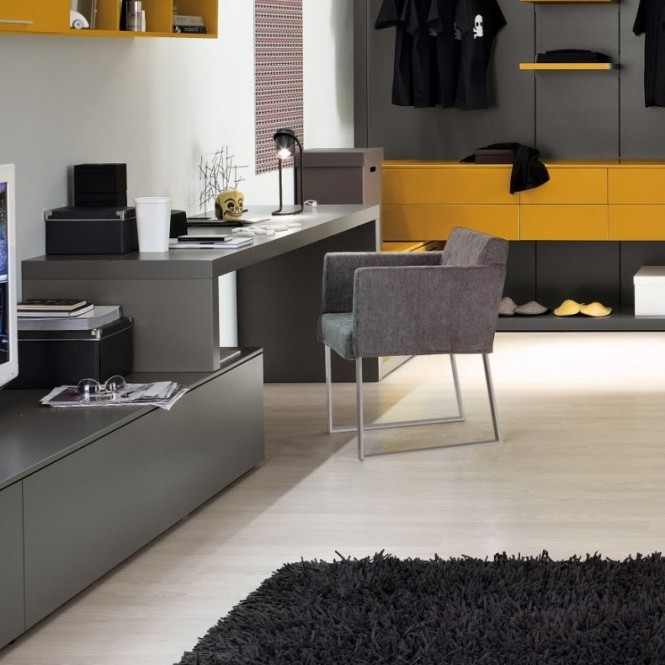 Sivi zidovi i ugaone garniture ili kreveti su osveženi elementima kao što su žuti stolovi ili natkasne. Ova jadnostavna kombinacija deluje vrlo efektno. Na slici ispod prikazana je spavaća soba sa ovogodišnjeg sajma nameštaja u Kelnu.